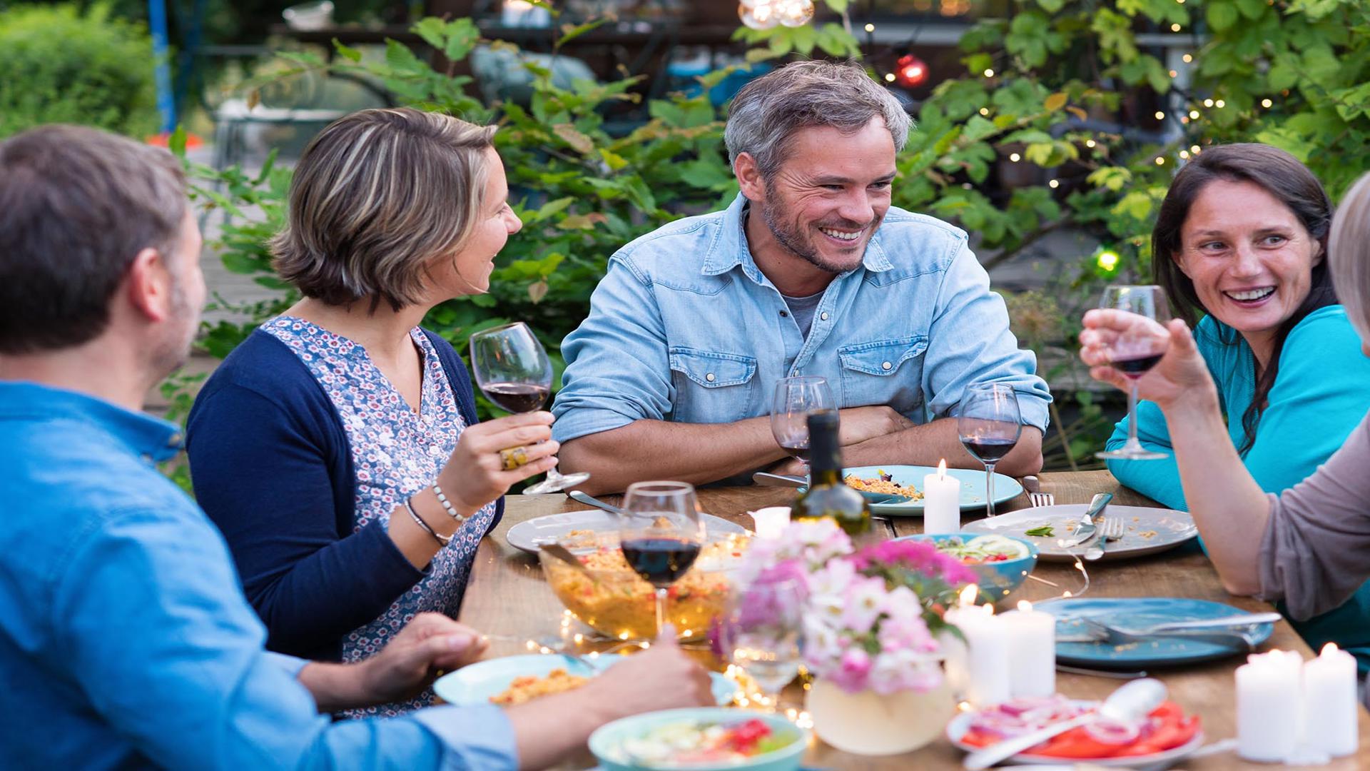 - Beautiful summer evening in the garden, a group of friends in their forties have a good time laughing together around a table.