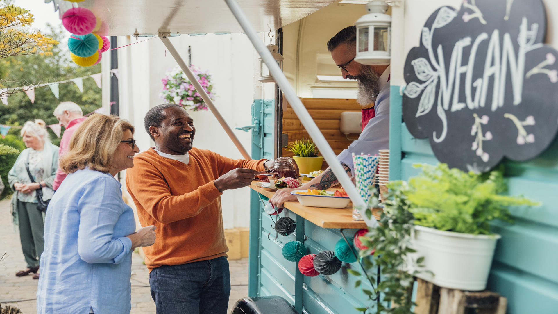 - Outside a serving hatch to a food truck where a hipster guy is hanging out and chatting to a multi ethnic group of adults. Colorful bunting hangs from the canopy and surrounds the painted truck.