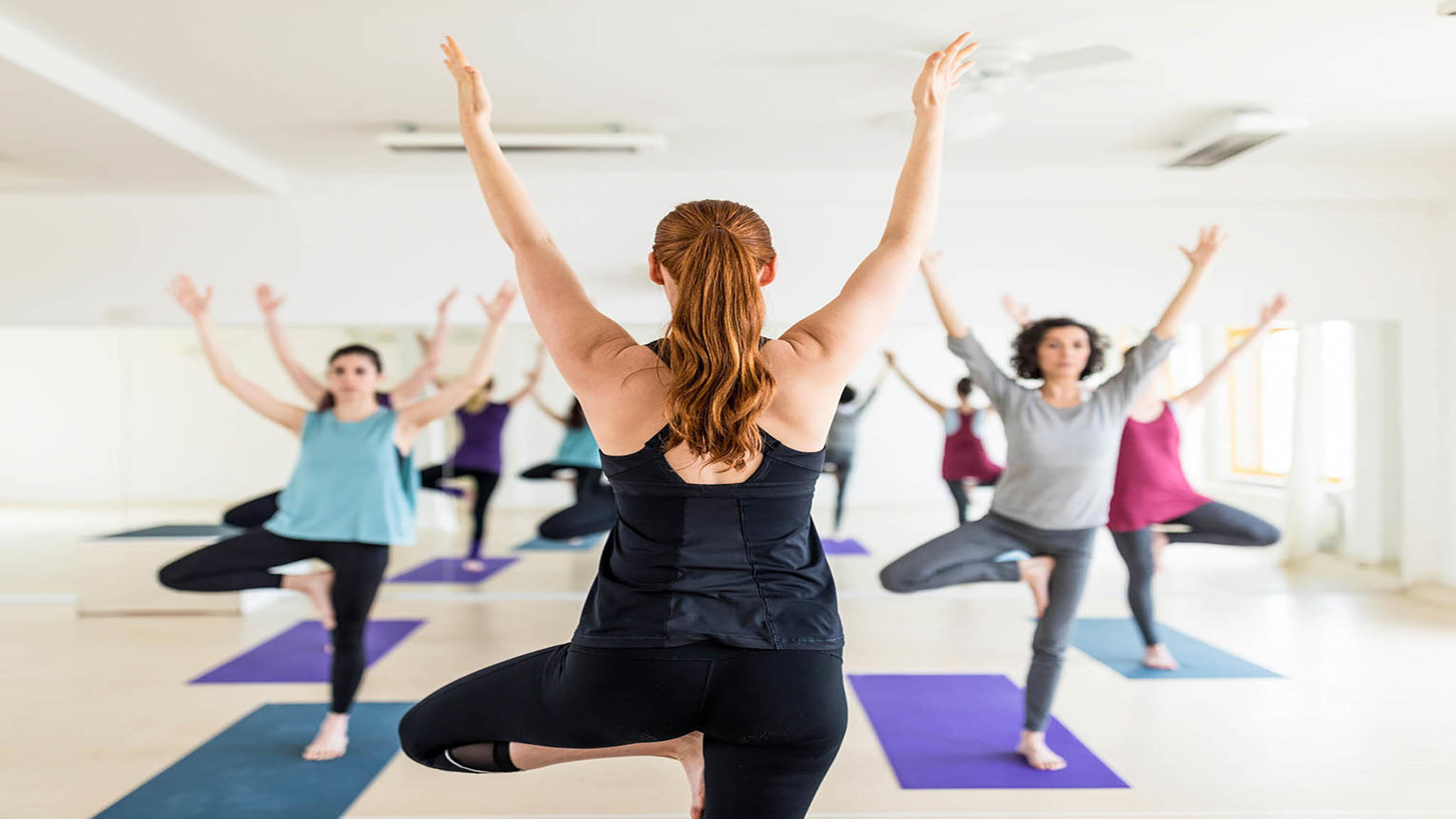 - Rear view of fitness female instructor with group of women standing in yoga pose during gym class.