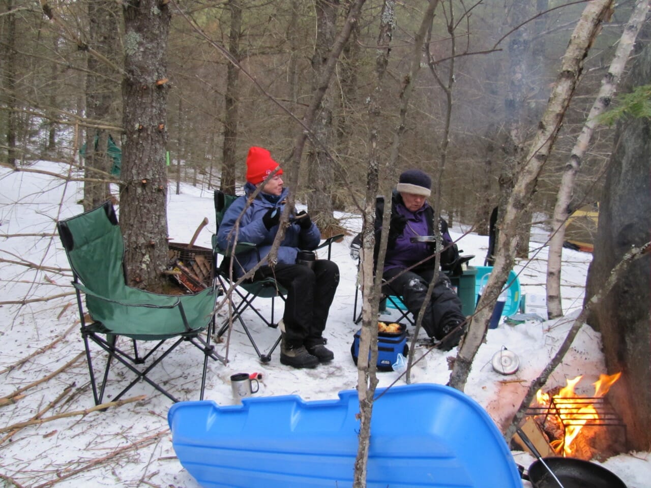 Looking a bit like they were about to cross Antarctica, they valiantly hiked into the Heath Forest one February afternoon. They arrived at their chosen camping spot without a hitch and immediately began to set up camp, unloading supplies and pitching their tent. The exertion of pulling the sleds with their heavy loads had caused them to work up quite a sweat, which is not a good thing in the cold. Rethinking what supplies were absolutely necessary would be an important consideration for future winter camping.