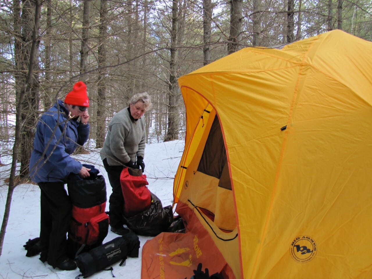 When Amy Hoffman first came to Eastman and got involved in local hiking, hike leader John Lloyd taught that being adequately prepared was essential to going up a mountain. Preparation became Amy’s bottom line for all outdoor activities. When she and her friends Maureen Connelly and Renee Gustafson decided to try winter camping, Amy was clear that they had to know everything about it before they started. The Aloha Foundation in Post Mills, Vermont offered an introductory course on winter camping, so she signed up. Armed with Amy’s new knowledge, the three intrepid campers carefully planned their first winter camping experience. It was a cold winter in 2010, but Eastman’s Heath property beckoned.